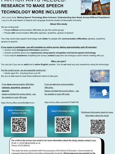 Join Lucy's study, 'Making Speech Technology More Inclusive: Understanding User Needs Across Different Populations.' Your help could make speech technology tools better for adults with acquired communication difficulties (aphasia, dysarthria, apraxia of speech).